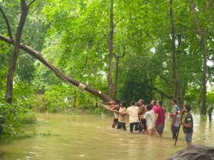 जिसके कारण विद्युत आपूर्ति बंद कर दी गयी। अगले दिन सुबह समाजसेवी राघवेंद्र उपाध्याय उर्फ बुच्चू के नेतृत्व में युवाओं ने कमर भर बाढ़ के पानी में अंदर जाकर घण्टो मेहनत के बाद पेड़ को काटा गया ।