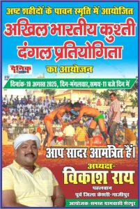 भांवरकोल:शेरपुर खुर्द में अष्ट शहीदों के स्मृति में आयोजित अखिल भारतीय विराट कुश्ती प्रतियोगिता 19 अगस्त ,दिन मंगलवार, समय 11 बजे दिन में आयोजन सुनिश्चित है। यह जानकारी पूर्व जिला केशरी विकास राय पहलवान ने दी।